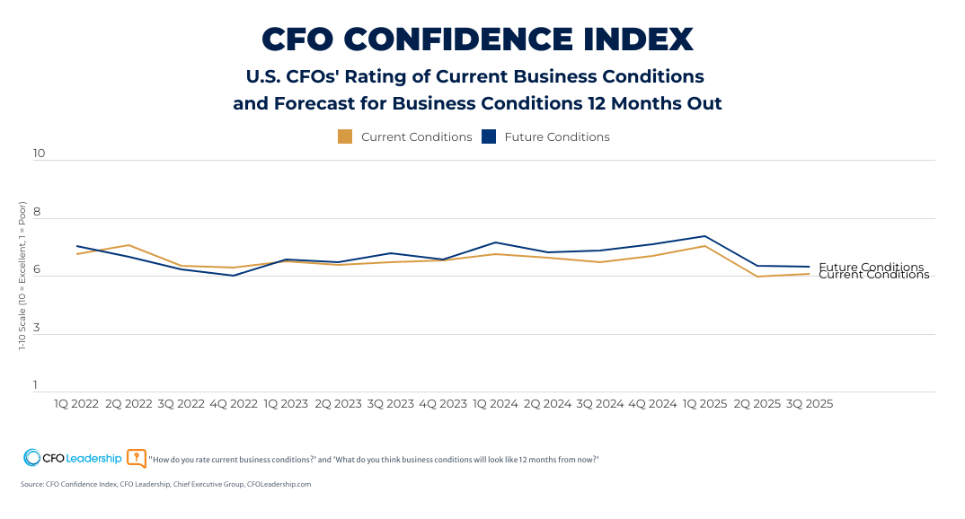 Just-released data from our third quarter CFO Confidence Index, conducted August 5 to 7 among 147 CFOs, finds their rating of current business conditions stalled at 5.5 (measured on a 10-point scale where 1 is Poor and 10 is Excellent)—the lowest level on record since the inception of the Index in 2020.