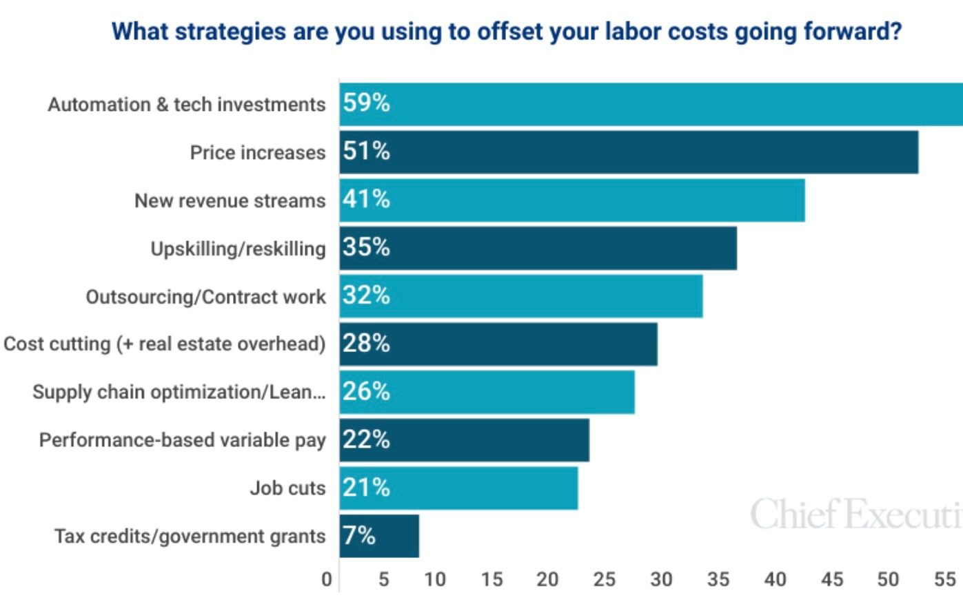 That’s the big takeaway from sister publication Chief Executive’s latest polling. Among the 182 CEOs surveyed November 7-9, 59 percent ranked automation and technology investment as the number one strategy they are pursuing to offset rising labor costs in 2024—even ahead of price increases, finding new revenue streams and reskilling existing workers.