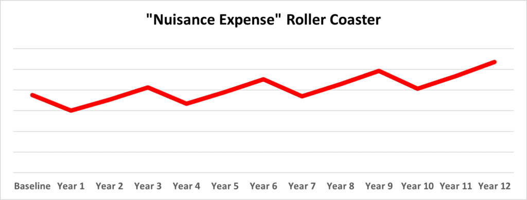Unfortunately, with complex indirect services, the typical output from your procurement department looks much more like the graph below. We’ve dubbed this the “nuisance expense” (or indirect services) roller coaster: