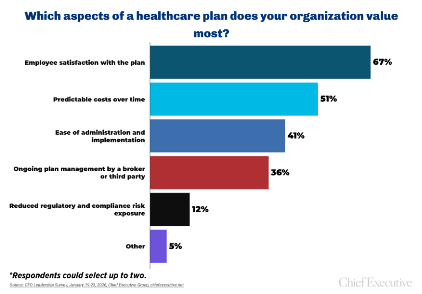 When asked which aspects of a healthcare plan their organization values most, 67 percent of CHROs cite employee satisfaction. Predictable costs rank second, selected by 51 percent. Ease of administration follows at 41 percent, while 36 percent point to ongoing plan management by a broker or third party. Only 12 percent cite reduced regulatory or compliance risk exposure.